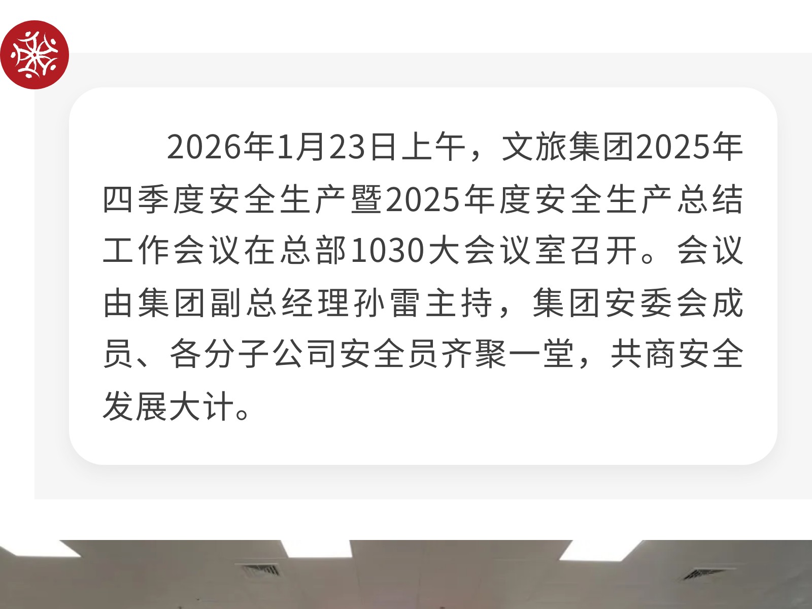 文旅集團(tuán)召開2025年安全生產(chǎn)總結(jié)會(huì)議 筑牢安全發(fā)展根基 發(fā)布時(shí)間:2026年01月27日 12時(shí)來源:本站原創(chuàng)瀏覽:34 人次