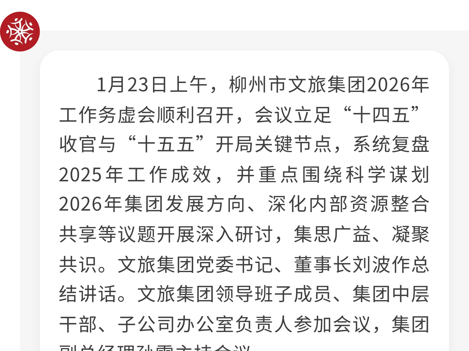 承前啟后謀新篇 凝心聚力向未來——文旅集團召開2026年務(wù)虛會 發(fā)布時間:2026年01月27日 12時來源:本站原創(chuàng)瀏覽:32 人次