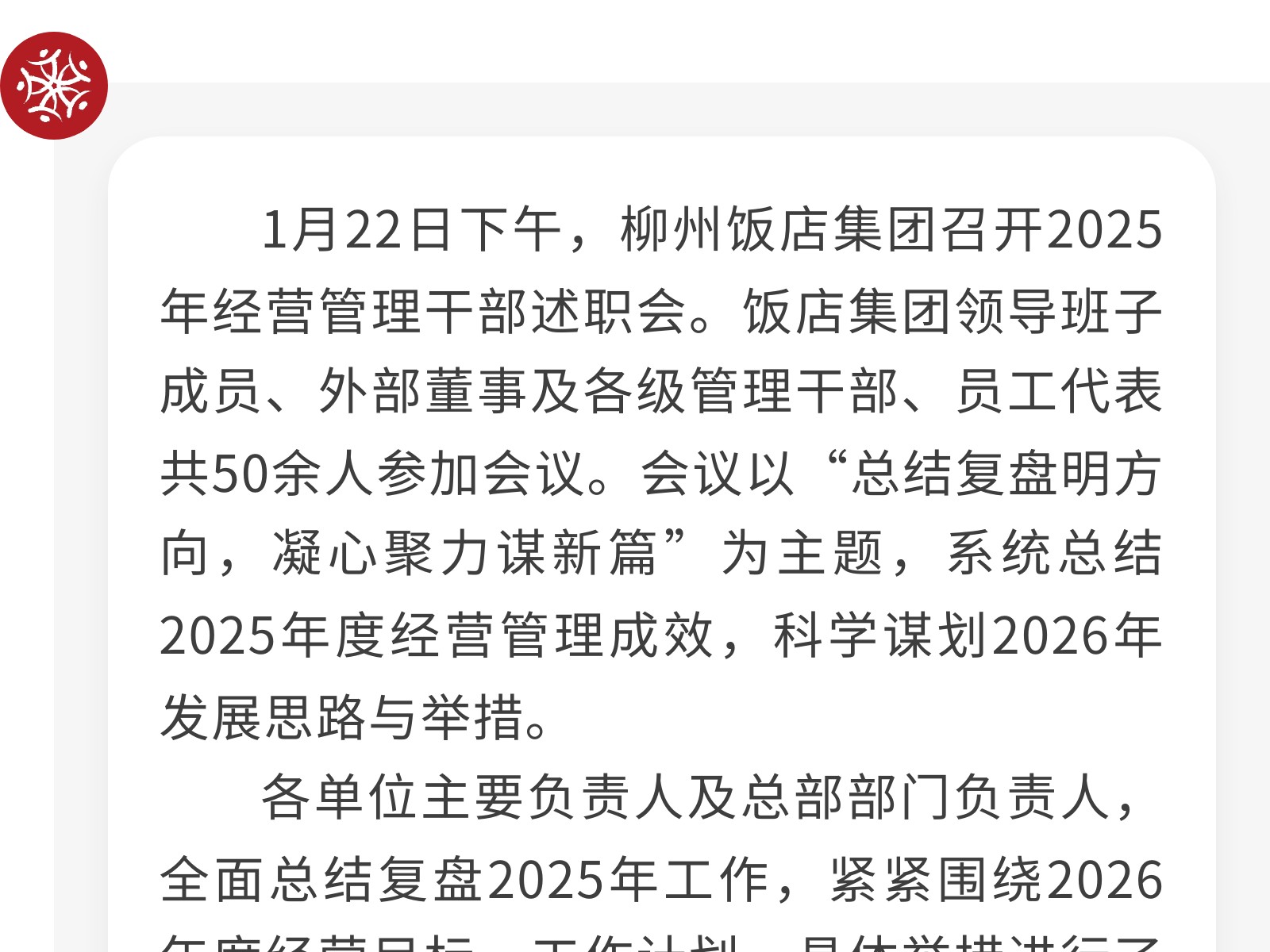 述職亮答卷,乘勢(shì)開(kāi)新局——柳州飯店集團(tuán)召開(kāi)2025年經(jīng)營(yíng)管理干部述職會(huì) 發(fā)布時(shí)間:2026年01月29日 10時(shí)來(lái)源:本站原創(chuàng)瀏覽:37 人次