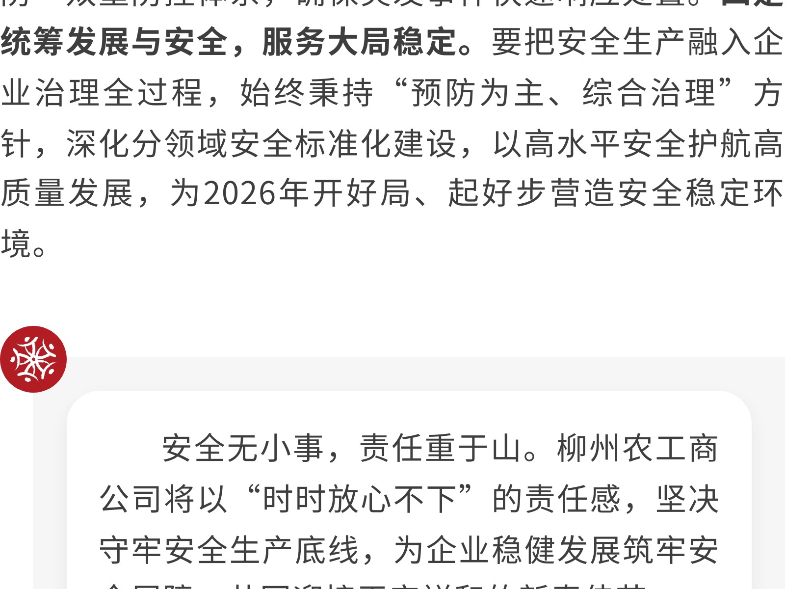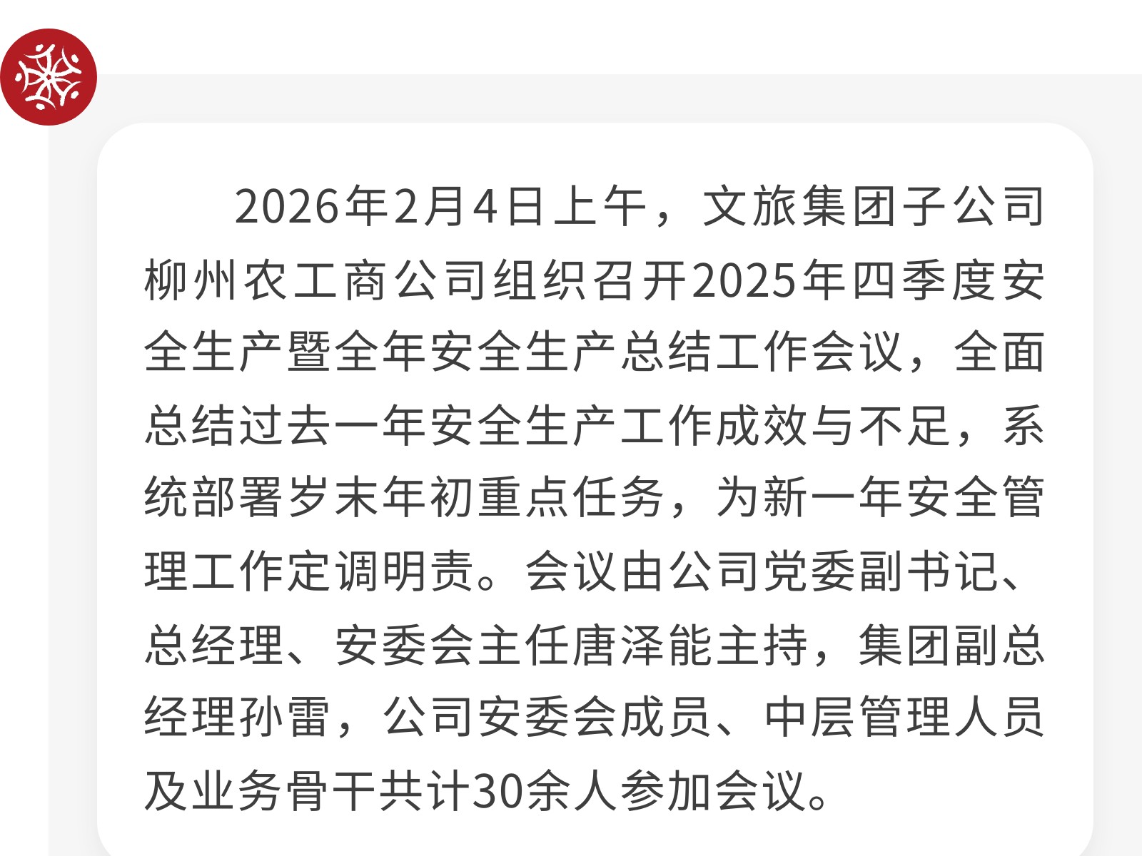 壓緊責(zé)任鏈條,筑牢歲末年初安全防線——柳州農(nóng)工商公司召開2025年度安全生產(chǎn)總結(jié)會(huì) 發(fā)布時(shí)間:2026年02月06日 12時(shí)來(lái)源:本站原創(chuàng)瀏覽:8 人次