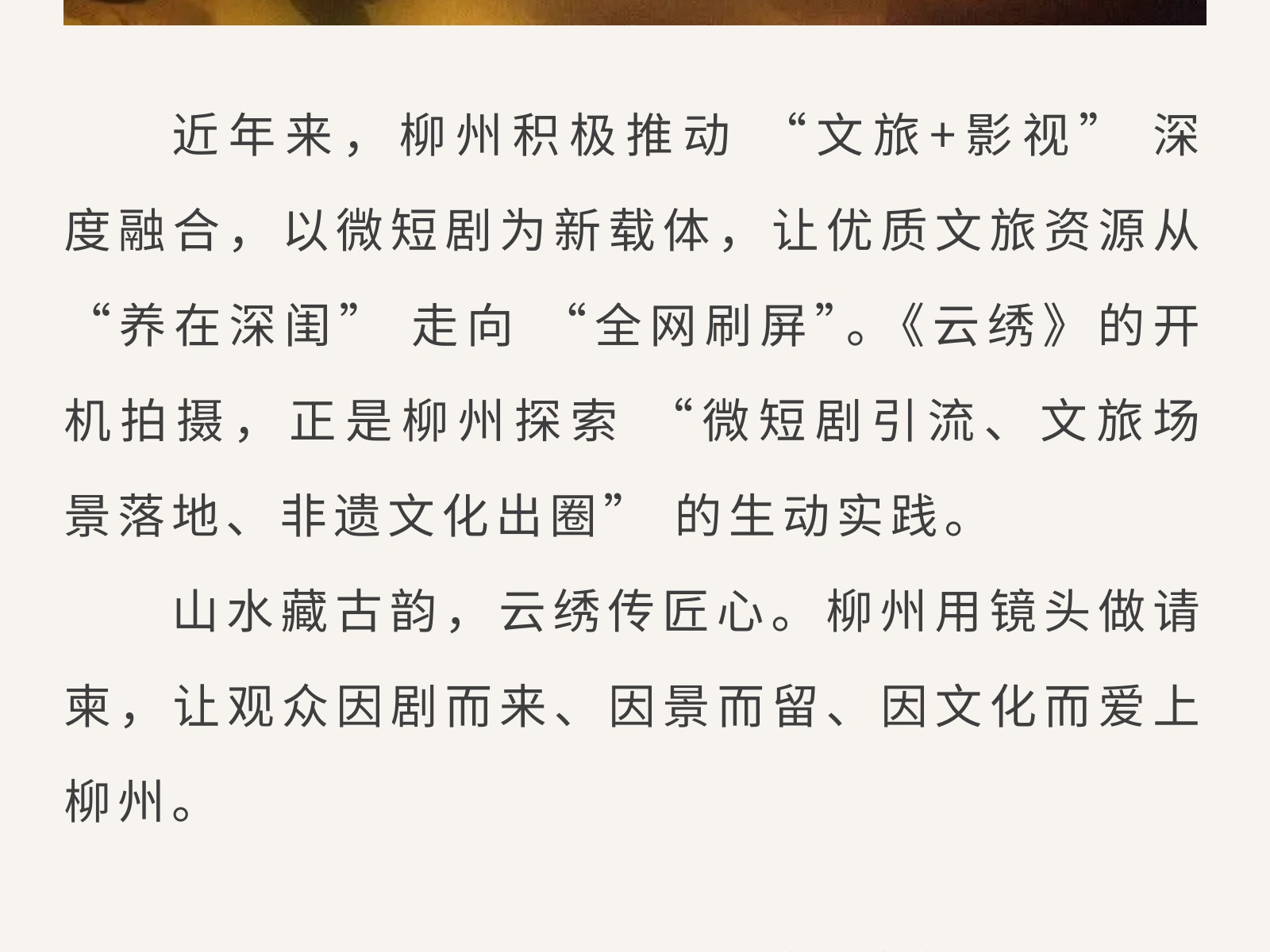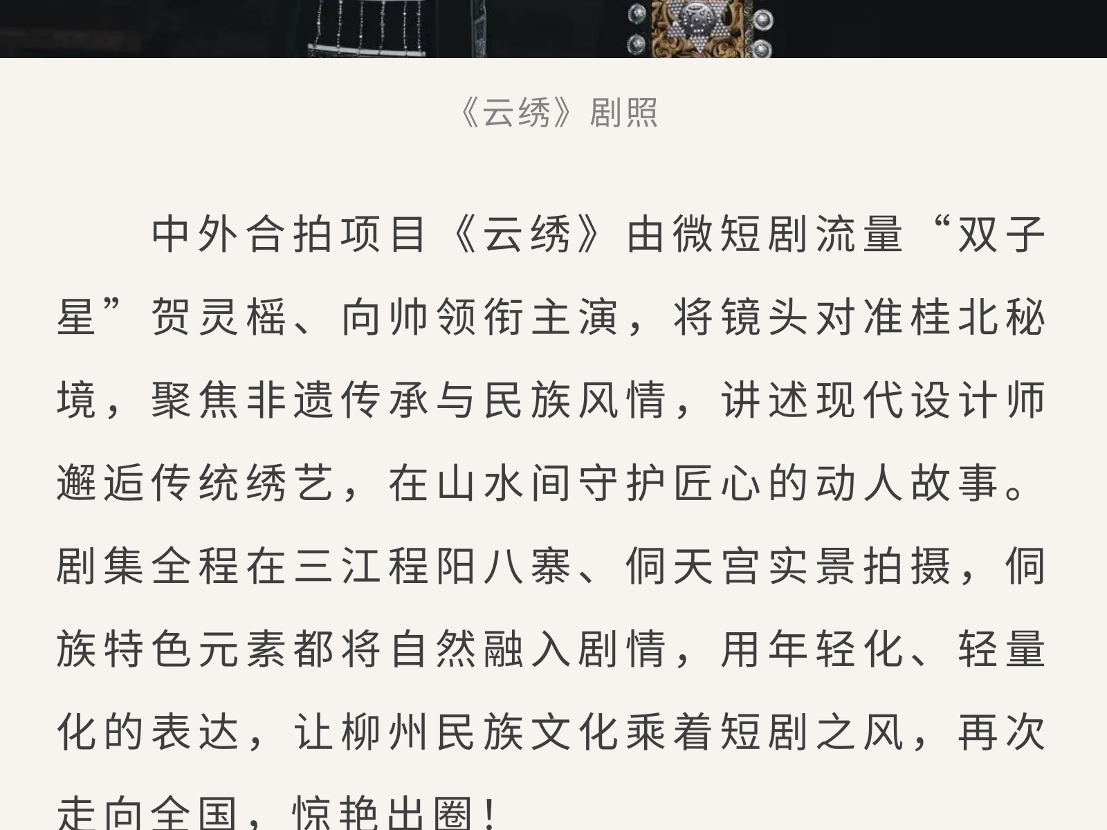 廣西“微短劇+文旅” 重點扶持項目《云繡》開機,把非遺風情拍入鏡頭里 發(fā)布時間:2026年03月06日 10時來源:本站原創(chuàng)瀏覽:3 人次