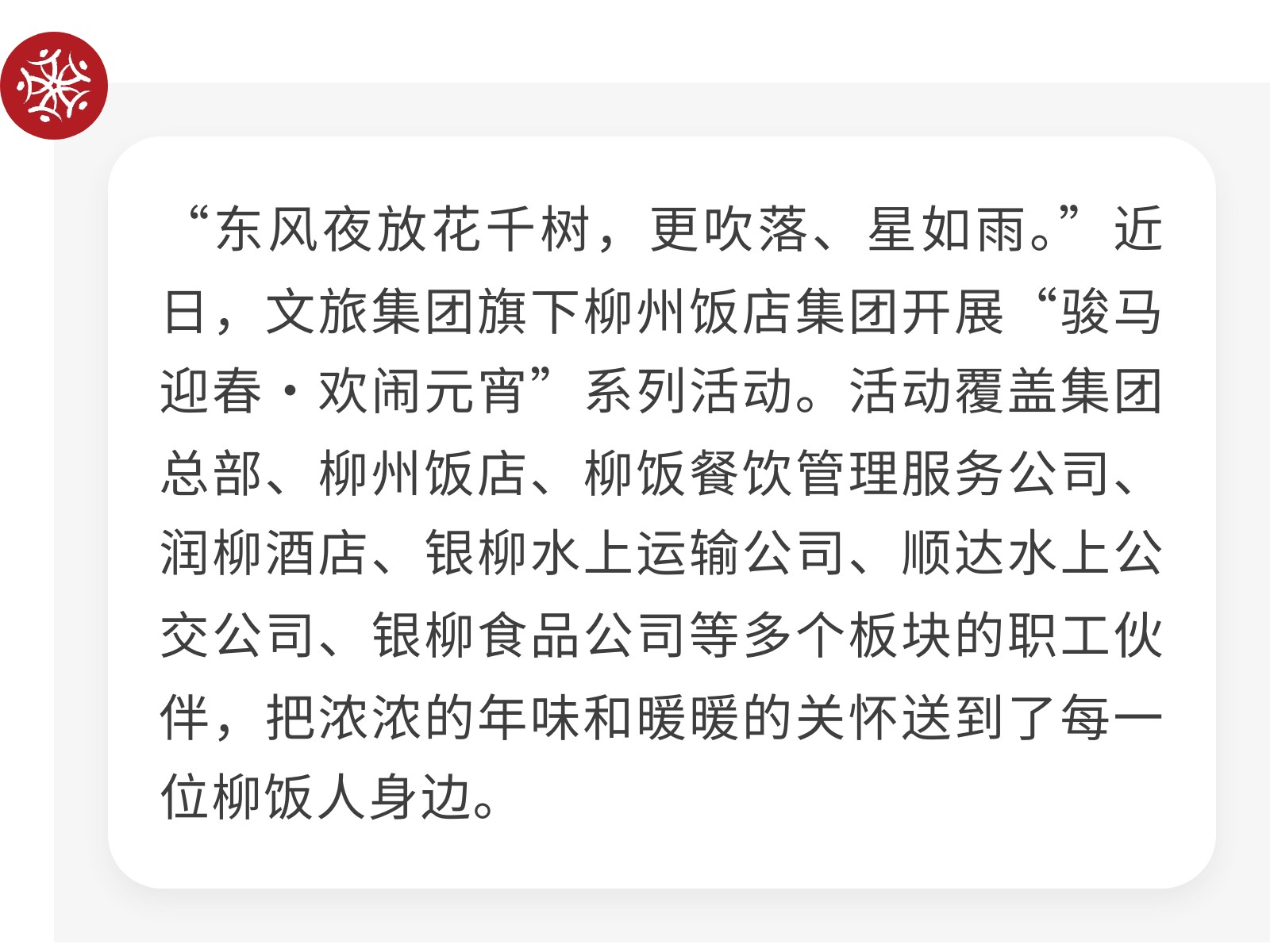 融傳統(tǒng)雅韻 聚奮進(jìn)合力——柳州飯店集團(tuán)“駿馬迎春?歡鬧元宵”系列活動(dòng)順利舉辦 發(fā)布時(shí)間:2026年03月06日 10時(shí)來(lái)源:本站原創(chuàng)瀏覽:3 人次
