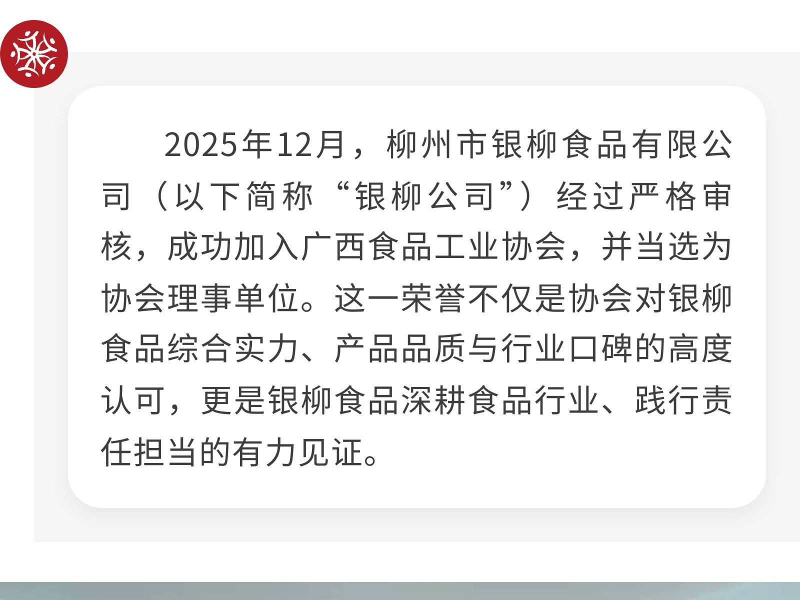 凝心聚力啟新程、勇?lián)姑蛭磥怼菔秀y柳食品有限公司當(dāng)選廣西食品工業(yè)協(xié)會(huì)理事單位 發(fā)布時(shí)間:2026年02月25日 15時(shí)來源:本站原創(chuàng)瀏覽:14 人次